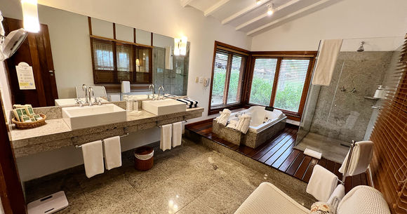 Confira os detalhes da acomodação: Ideal para famílias grandes ou grupos de amigos, o Bangalô Master oferece 114,60 m² de espaço interno, garantindo conforto e privacidade para até 6 pessoas. A acomodação conta com um quarto com cama king size e dois quartos anexos com camas de solteiro full size, todos com banheiro privativo. A sala é ampla e integrada, com TV em cada quarto e também na área comum. A generosa varanda de 33,30 m², localizada a apenas 100 metros da recepção, é perfeita para reunir todos e aproveitar a atmosfera tranquila da ilha com muito mais comodidade.